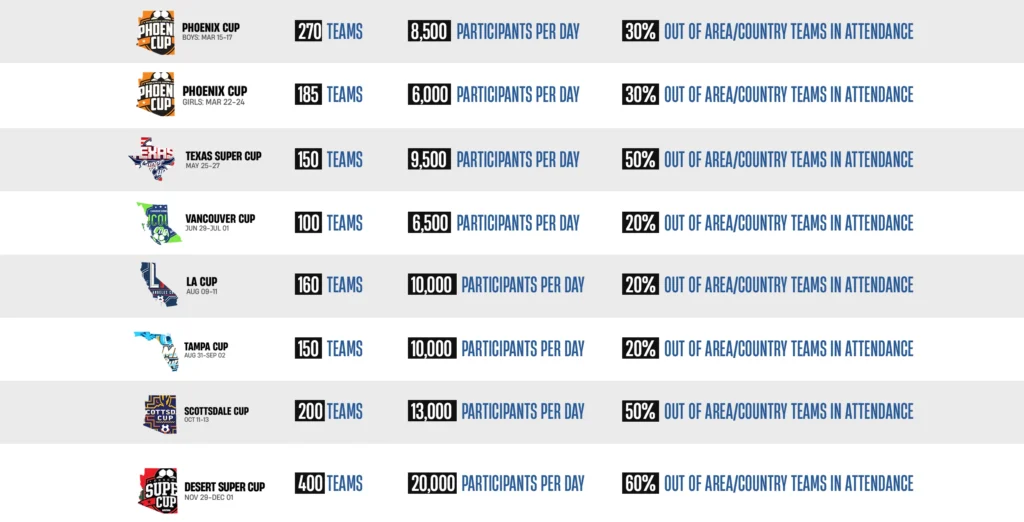 Rated Sports Group, a premier organizer of youth sporting events in North America, presents exclusive sponsorship opportunities to engage with numerous participants across 11 events at 31 venues. Initially established through small-sided camps and tournaments, Rated Sports Group now hosts renowned competitions such as the Phoenix Cup, NYC Cup, and Vancouver Cup, drawing elite teams worldwide to compete in various cities nationwide. Seize this chance to align your brand with our event attendees!